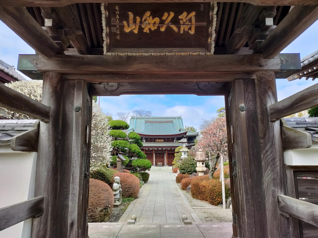 階段を登り、門をくぐった先には、きれいに清められた、想像以上の広い境内が広がっていました。左手に梅が咲いていて、春の訪れを感じることができました。