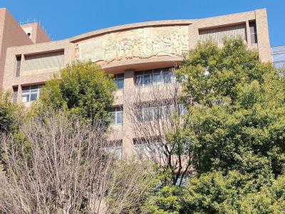 今回、周辺を散策している途中で、おそらく初めてではないかと思いますが、こちらの東京医科歯科大学をまじまじと見上げてみました。すると、高層建物の上部に壁画のようなものが見えました。調べてみたところ、総合教育研究棟の最上部に掲げられた記念壁画レリーフでした。