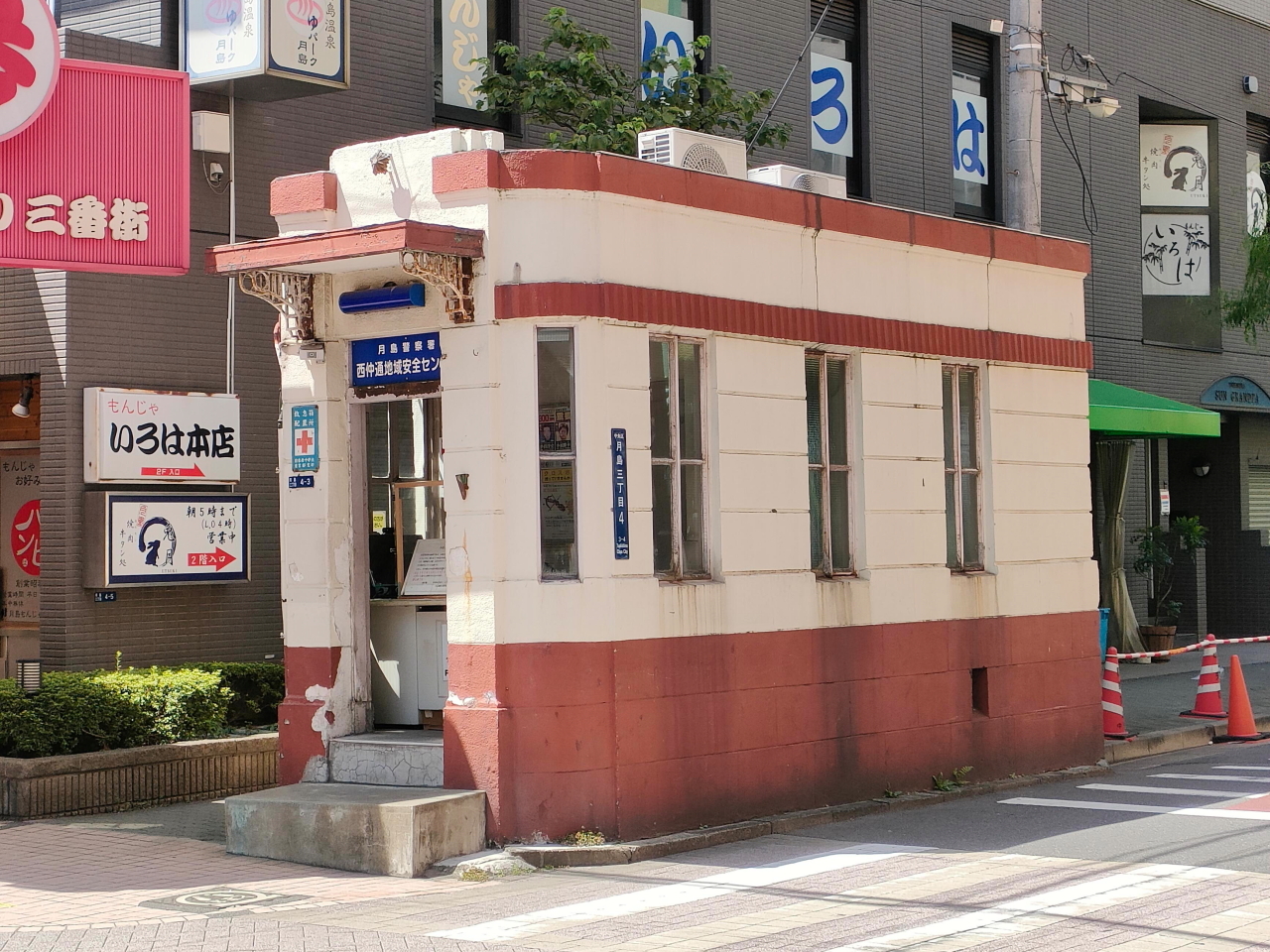 月島警察署西仲通地域安全センターは、月島もんじゃストリートの中ほどにあるこぢんまりした元交番の建物です。造られたのは、大正15(1926)年と約100年近く前で、警視庁に現存するものの中では、一番古い建物だそうです。