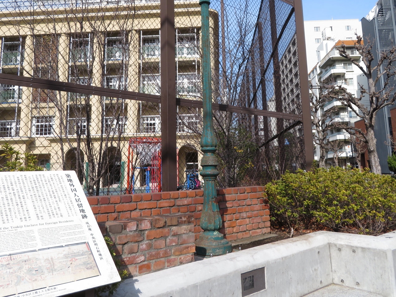 明石小学校南東の隅の交差点部に、かつてここの築地外国人居留地があったことを述べている案内碑があります。