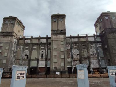 3つの塔が並ぶ巨大な建築物。塔の上部などにある花綱模様の円窓が素敵です。ただ、惜しむらくは肝心のかつて人々が競馬を見ていた観覧席を見ることができないのです。それは、米軍施設がその前にあったためです。