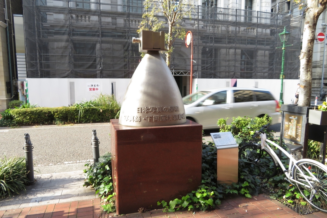 馬車道沿いに、少し変わったモニュメントがあり、「日本写真の開祖 写真師・下岡蓮杖顕彰碑」と記載されています。