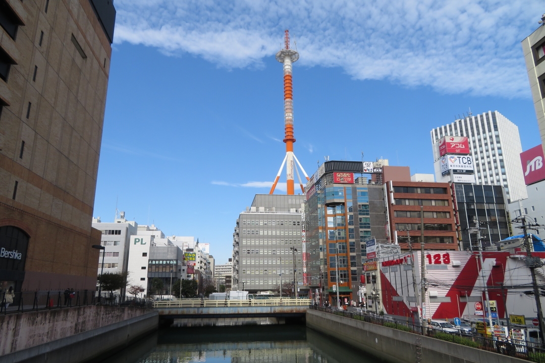 横浜駅近くにあるビルです。味気ない四角いビルの上に、青空に映える紅白の塔がそびえたっています。
