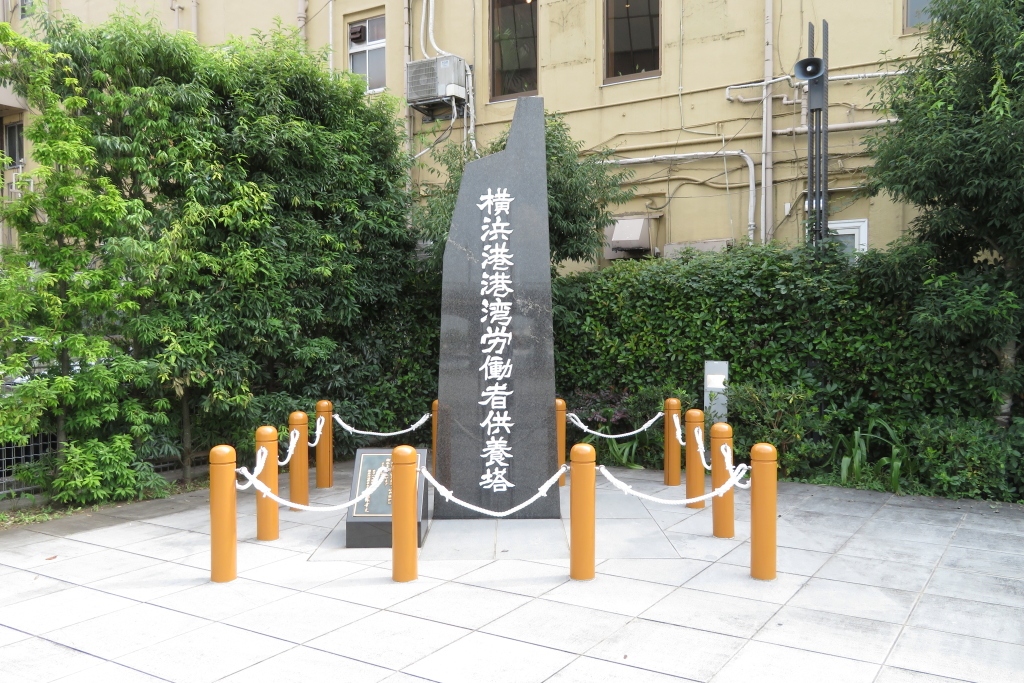 こちらの供養塔は、横浜港で不慮の事故で亡くなった港湾労働者を供養するために建てられたものです。元々は昭和49(1974)年に山下ふ頭に設置されていましたが、横浜港開港150周年を記念して、平成21(2009)年に、横浜港発祥の地である象の鼻パークに移転しました。