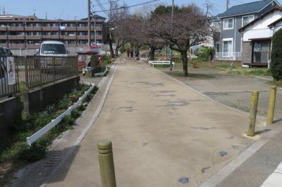 大和市内のつきみ野付近の旧道を歩いている途中で出会いました。歩いていた旧道は南北に、こちらの散歩道はほぼ東西に続いており、少し寄り道をして散策しました。花が咲いて華やかな道になっており、さらに遊具などもありました。