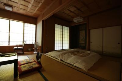 - 和室2間で、片方が寝室。チェックイン時にはすでに寝室にお布団が引いてあり、朝まで誰も入ってこない。部屋も広くて良い。ただ離れの風呂は残念。