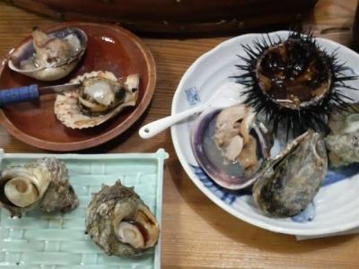 貝焼膳には、さざえ・大あさり・うに・日の出貝・牡蠣がのっていて、更にここのクーポンを見せると、焼き貝(このときはさざえ)がサービス。