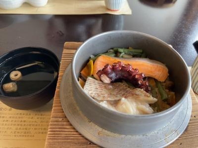くつろぎ釜を頂きました。(鯛・鮭・蛸・山菜)が入っていて食べ応えあり、とても美味しかったです。