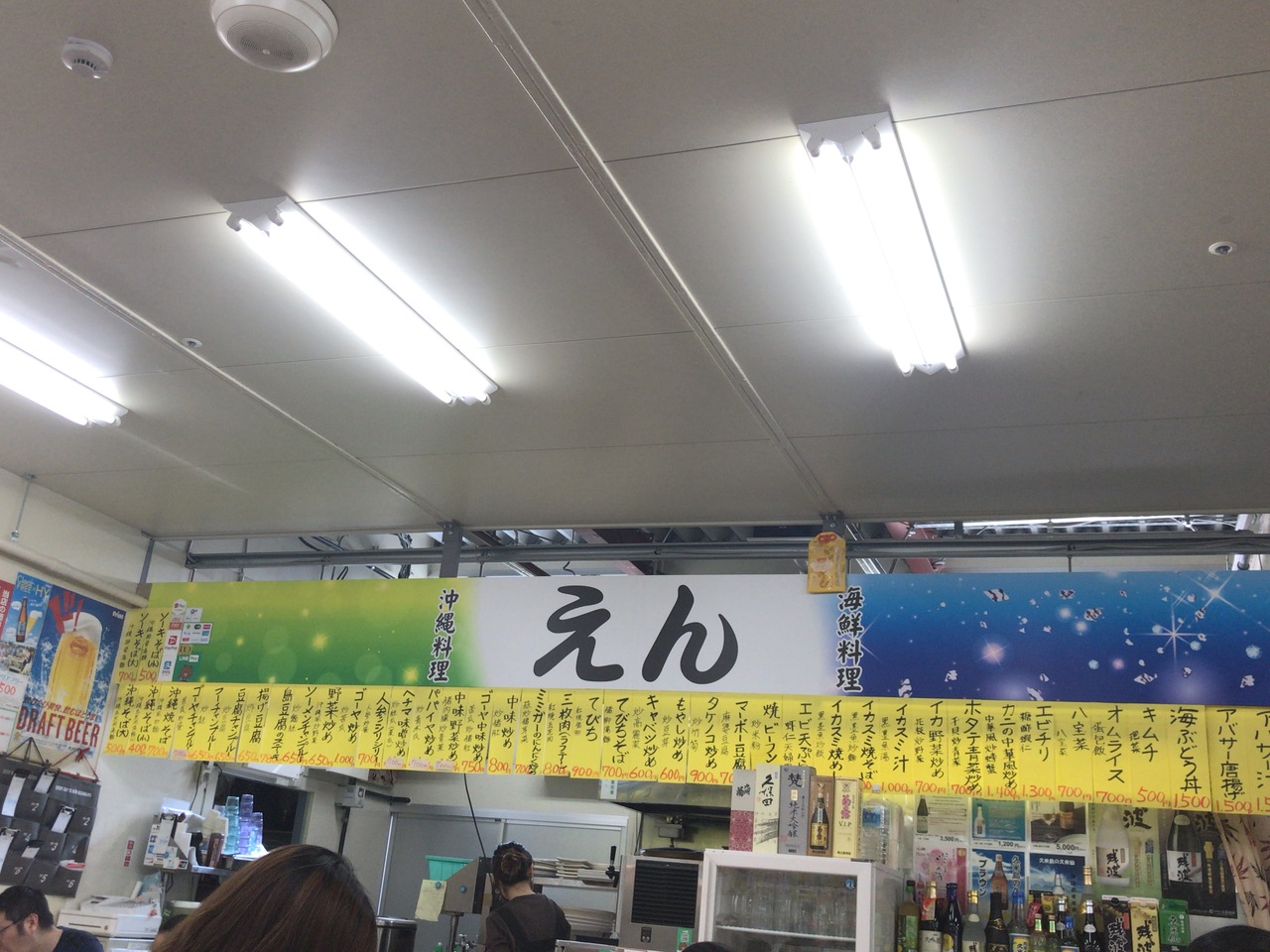 食券を入り口で買います。沖縄料理や定食など沢山の種類がありました。5時半くらいでしたが、ほぼ満席。
