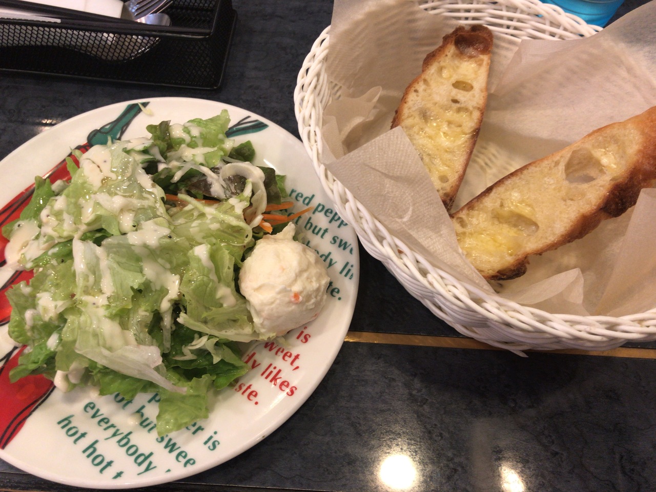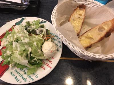 ランチはサラダ、パンが付きます。タラコカルボナーラ(タラカルボ)がオススメです。