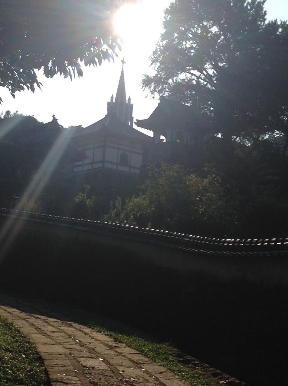 海岸通りからとても雰囲気のある石畳みの坂を登った高台にフランシスコ・ザビエル記念教会と光明寺、瑞雲寺がみえます。西洋文化と日本文化の両方、平戸独特な風景です。
