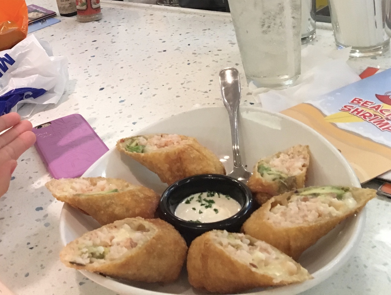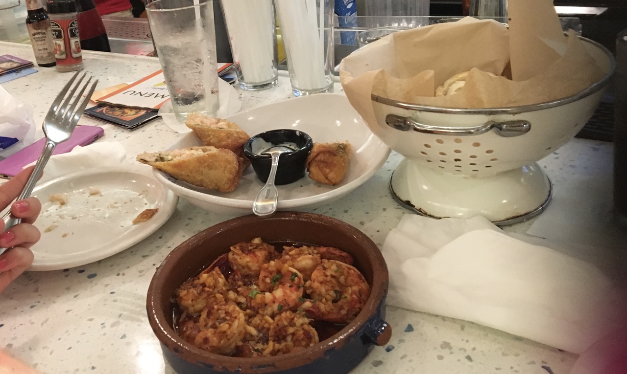 女子組も結構いました。ガーリックシュリンプとカルフォルニアシュリンプを注文したらパンが付いてきました。ふわふわでした。