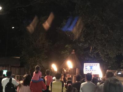 トラムに乗る前に何か食べるつもりで早めに園内へ。外でのレストランでハンバーガーを。意外に空いていました。ファイヤーショーも見れますが、時間が合わず目の前で見れず。