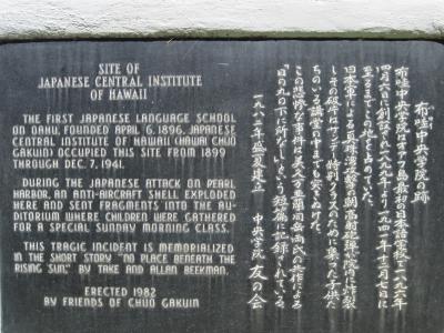 1941年12月8日(ハワイ現地では12月7日)、真珠湾攻撃を日本は行いました。でも、その攻撃は真珠湾に対してだけ行ったのではありません。カネオヘ、ディリンハムなどの軍施設、そしてハワイ経済の中心地ホノルルも同時攻撃。ホノルルにあった日本人学校も悲劇に遭いました。ここは当時の惨状、その時、現地在住日本人は日本をどう考えていたのか、記念碑として残っています。是非、ご覧頂きたいと思います。
