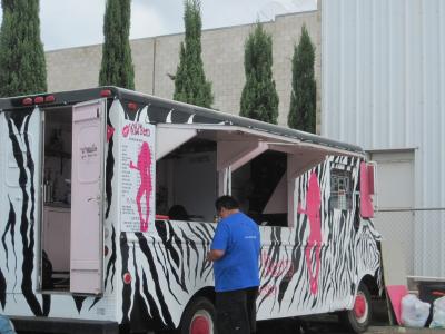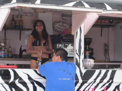 このお店の大きな特徴。「ランジェリー・ワゴン」。つまり店員さんは下着姿でコーヒー・スムージーなどを販売しています。これは合法なお店で、シアトルあたりで流行っているお店をハワイでも始めました。工場地区だけに基本料金は安いお店が多い中、ここはワイキキ並(笑)