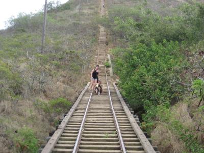 このトレイルの特徴。太平洋戦争時代、米軍はこの山の木を切り出し資材とするため、トロッコを運搬する線路を敷きました。今はその名残となってますが、その線路沿いを山頂まで登るというものです。