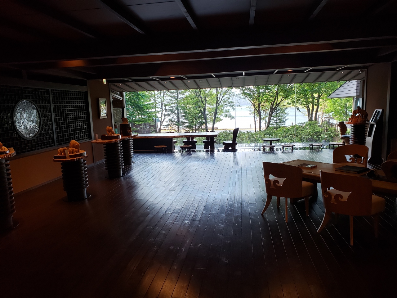 ロビーは大変に静かな雰囲気を保っています。向こうに阿寒湖が見えます。ロビー奥には足湯もあり、またすぐに阿寒湖まで出ることができます。