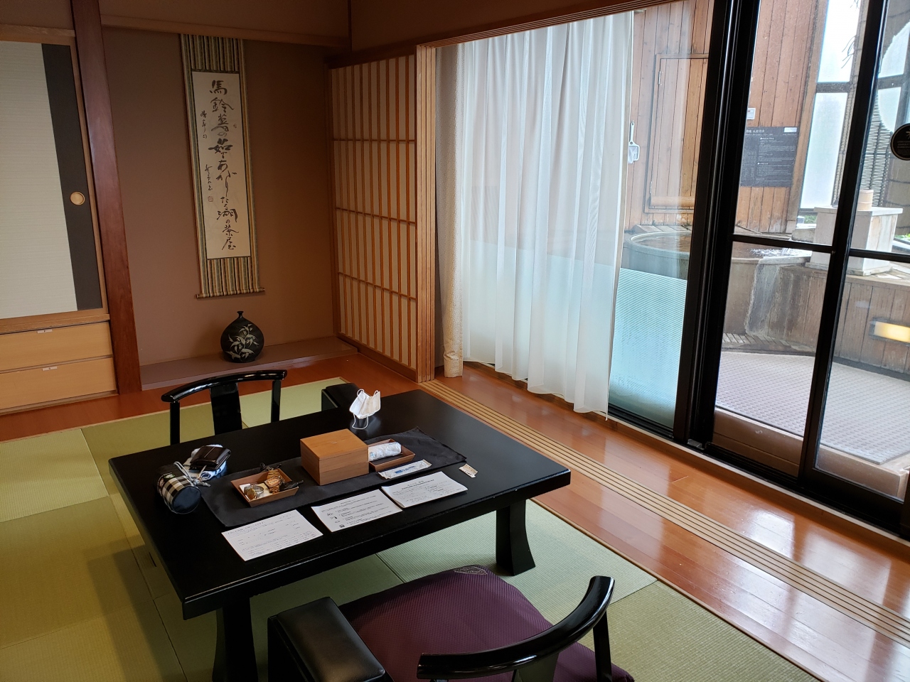 案内された部屋は1階で、温泉施設の奥でしたが当たりでした。なにしろ大浴場前すぐの上に玄関とは反対側なので外来客も来ず静か。エアコンの利きも良くて満足できました。温泉はやや小さめでしたが露天もあります。WiFiもよく通っていました。