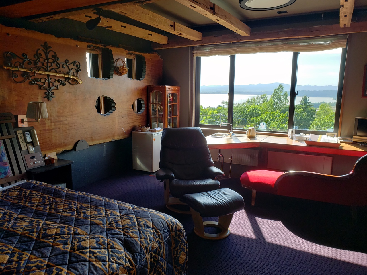 評判の良いオーベルジュ。オーベルジュなので、大型のホテルとは違い、客室を始めとして建物は手作り感があります。泊まった部屋はメゾネットで、階下には大きな風呂が用意されていましたが、お湯の出が悪く使えません。ただし大浴場のほうはほぼ貸切り利用のような形が取れます。網走湖まで眺めがよく快適でした。