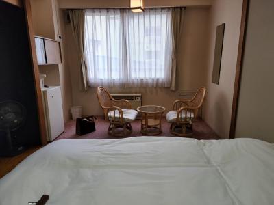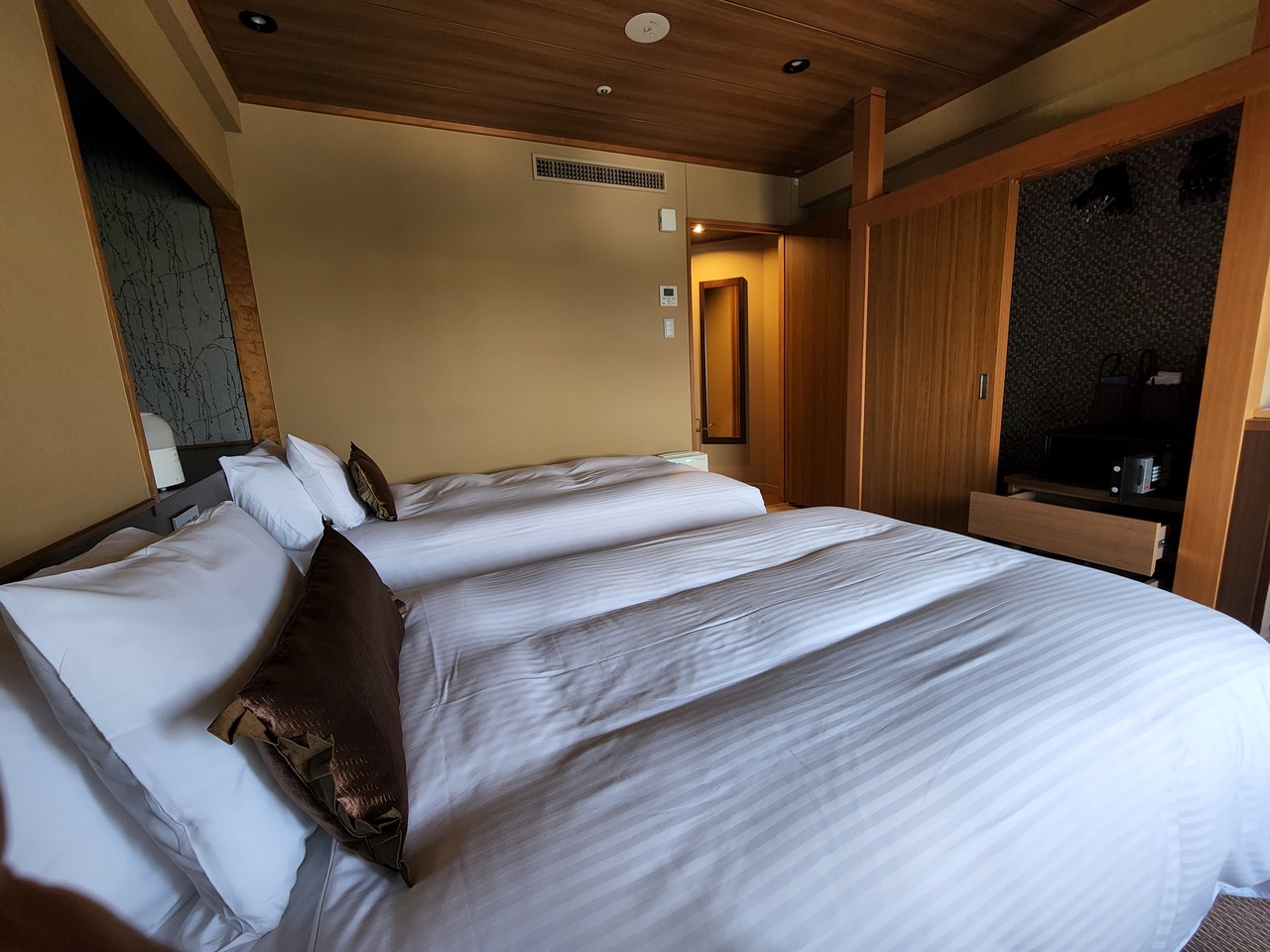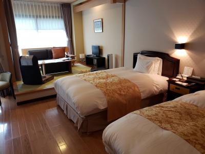 部屋は畳にベッドでした。昔ながらの和室でしたが、ベッドのほうがホテル側も、お客も楽ですね。いつでも寝られるし。
