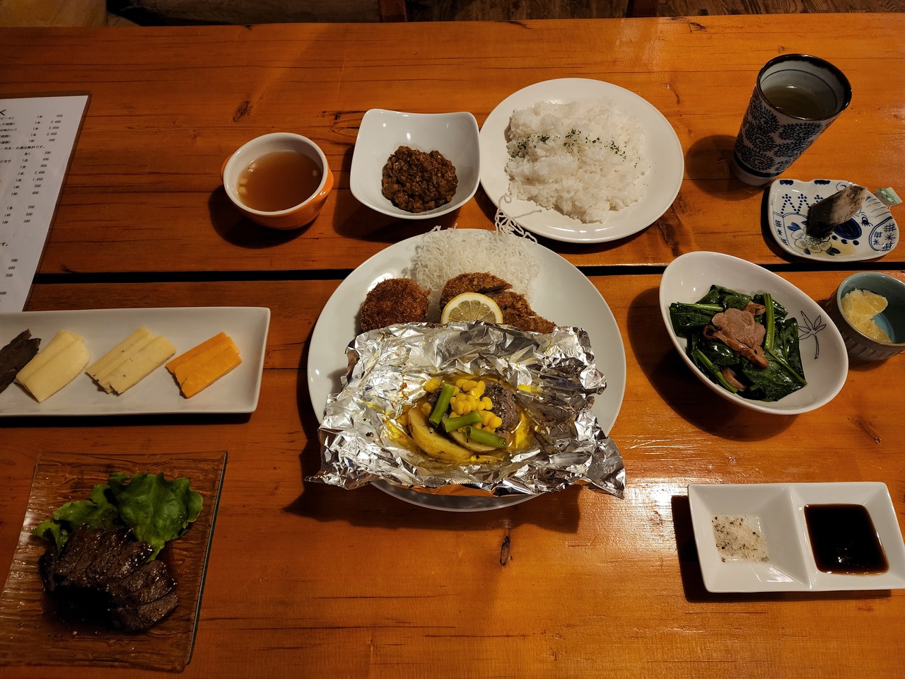 ここは前もって注文しておけばエゾシカ料理が食べられます。エゾシカは大好きなので頼んでおきました。エゾシカは、ステーキ、ハンバーグ、メンチ、カツ、スモークと様々に調理されたものを出してくれました。どれも大満足でした。これだけエゾシカ料理が食べられる宿はそうはないのでは?