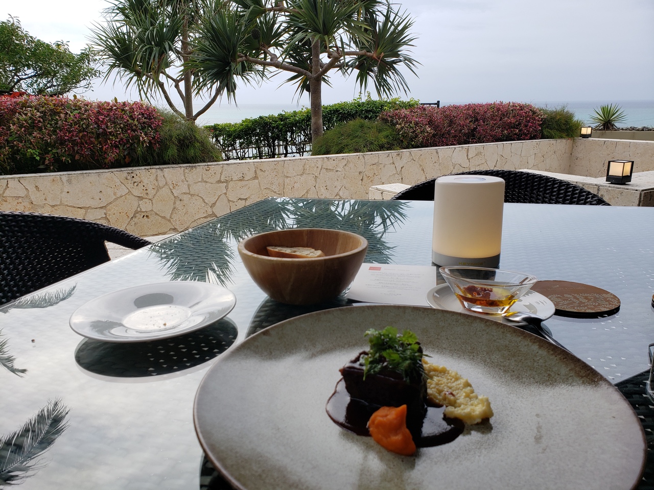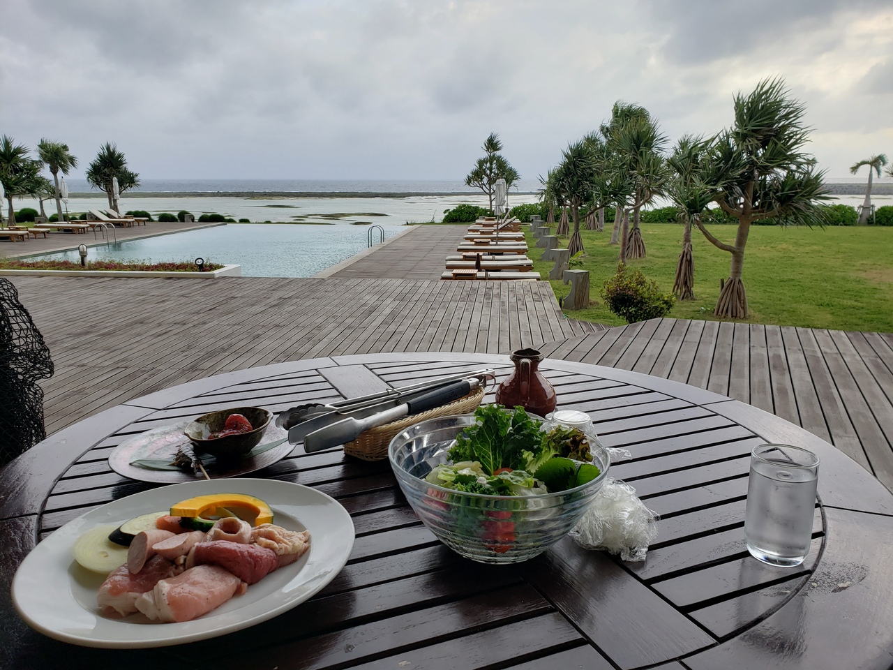 ホテル自体の歴史は長いようですが、古さを感じません。食事は、夕食はテラスでのBBQを選びました。島の食材をたくさん使っており、海と浜の眺めも良くて最高でした。プールにはまだ入れない時期でしたが、絵的には素晴らしい。