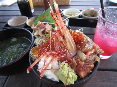 その姿に圧巻です、一度試してみたくなります。ただ、ごてごてと大盛りにしているわけではなく、味も新鮮でなかなかですし、魚介の品数も豊富。ちょっと食べにくさはありますが、すっごく思い出にもネタにもなります。是非お試しを。テラス席で海を眺めながら、ロケーションは最高です。