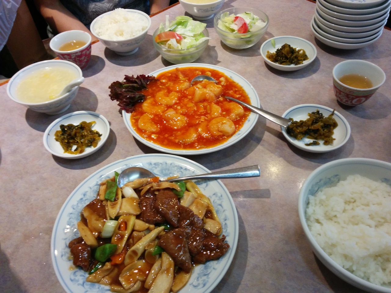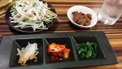 最初にナムルなど3品、次に牛スジの煮込み、サラダが来ました。