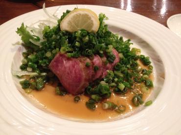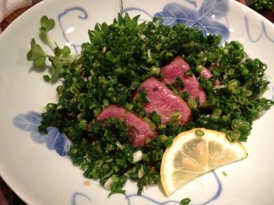 表面だけをサッと炙った牛タンのたたきに、たっぷりの浅葱です。