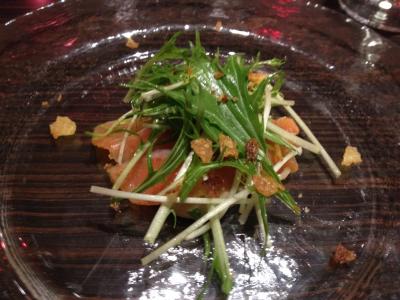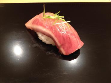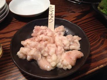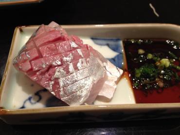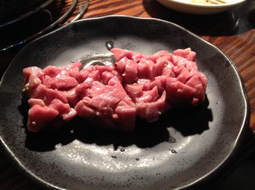 タン元だけを使った霜降り具合がすごいピンク色で大トロの様に口に広がる旨みととろけ具合が良い塩梅でワサビ醤油でゆったりと頂きます。