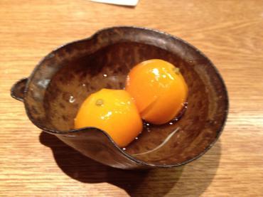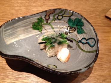 店内は、1枚板の見事なカウンターで横には坪庭があり、いかにも大人の隠れ家的な落ち着いた空間です。