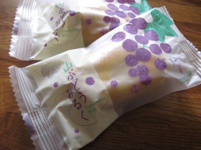 店内には生ケーキから、焼き菓子までたくさんのお菓子が並んでいました。山ぶどうを冠したお菓子も多くありました。迷いに迷ってかったのが「山ぶどうみるく」。ミルク餡のなかに山ぶどうのジャムのようなものがはいっています。山ぶどうはすっぱいのかなと思っていたのですが、甘くもなく酸っぱくもなく初めて食べる味でした。