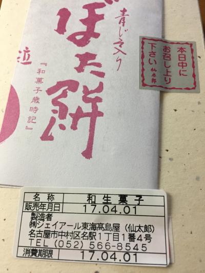 高島屋名古屋で兼ねてから気になっていた仙太郎のぼた餅を購入しました.仙太郎は京都にある和菓子屋さん.今回,粒餡・きなこ・抹茶のぼた餅.粒餡は小豆の香り高くしっかりした味で丁度良い甘さです.抹茶あんは新発売の様ですが,サラサラとして非常に滑らかな印象.何のぼた餅も美味しゅうございました.