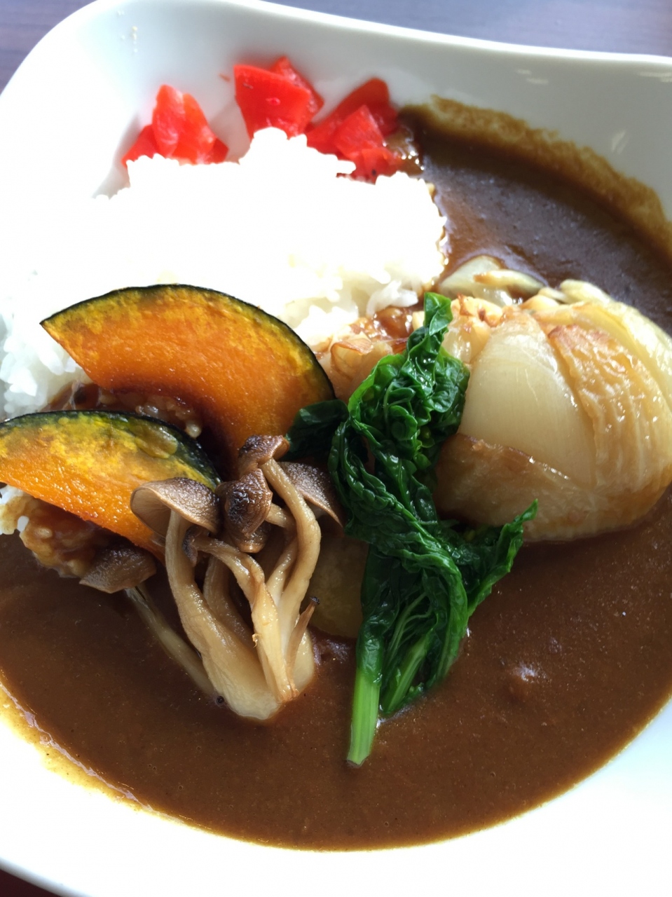 淡路島の特産品として有名な玉ねぎが丸ごと1個入った野菜カレー.スパイスはそれほど効いていませんが野菜の甘みがタップリと感じられる一品となっています.どこか懐かしいティストなので子供からご年配の方まで幅広く受けると思います.ただ840円はチトお高いか.