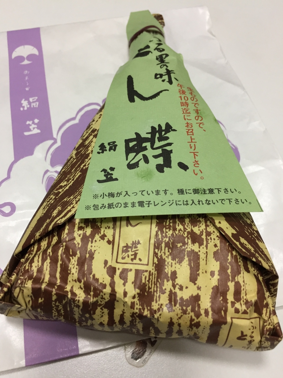 新大阪駅在来線構内にある駅マルシェ.大阪を始め近畿の銘菓,お土産が所狭しと並んでいます.ケーキやチョコなどがある一角に何やら独特の包装紙で包まれたとん蝶を発見.夕方に行くと売り切れで入手できないこともあるので要注意.餅米に大豆や塩昆布をあしらいカリカリ梅がトッピングされたおこわです.しっかりとした味付けで食べ応えも十分.ただ添加物が多いのが気になります.