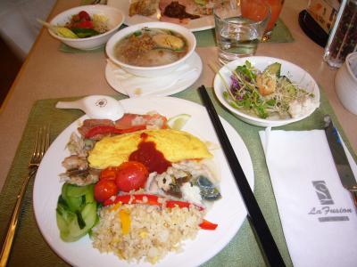 ホテルで朝食をと思いましたが結構な値段でしたので周辺の定食屋で済ませました.アワビ粥や焼魚定食などですが格安で食べられるお店は沢山あるので便利です.- 旅行時期