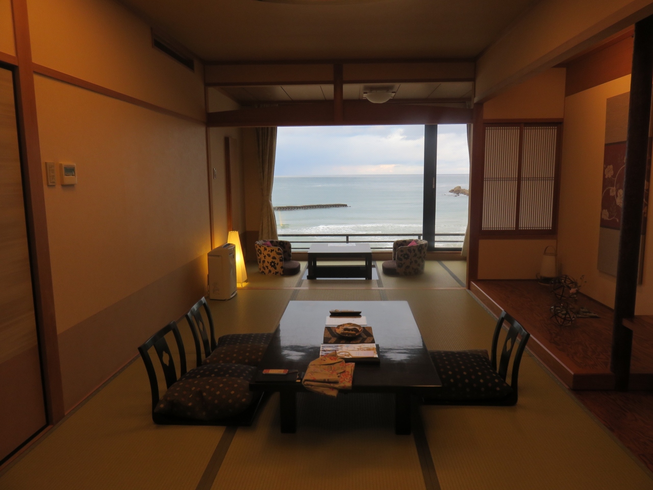 年末だったので値段は高かったけど、申し分ありません。部屋のお風呂は温泉ではありませんがゆっくり入れました。部屋の窓が全面ガラス張りできれいに磨いてあって海が見えてよかったです。曇っていて夕日が見えなかったのが残念でした。食事もカニのほかにのどぐろの煮つけや但馬牛などおいしいものばかりで満足しました。レストランの外ではおかみさんが「満足いただけましたか」と言ってくださりとても感じがよかったです。受付のスタッフやレストランのスタッフもみな気持ちの良い人ばかりでまた宿泊したいと思います。