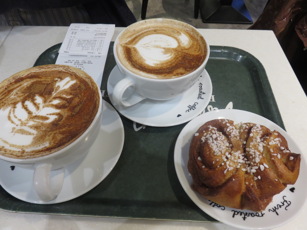 ヘルシンキ中央駅の中のお店に入りました。歩き回って疲れていたので席に座っていただきました。チャイラテはシナモンたっぷりで大きなカップになみなみ、とても美味しかったです。シナモンロールもとても美味しかった。店員さんもとても気さくでした。