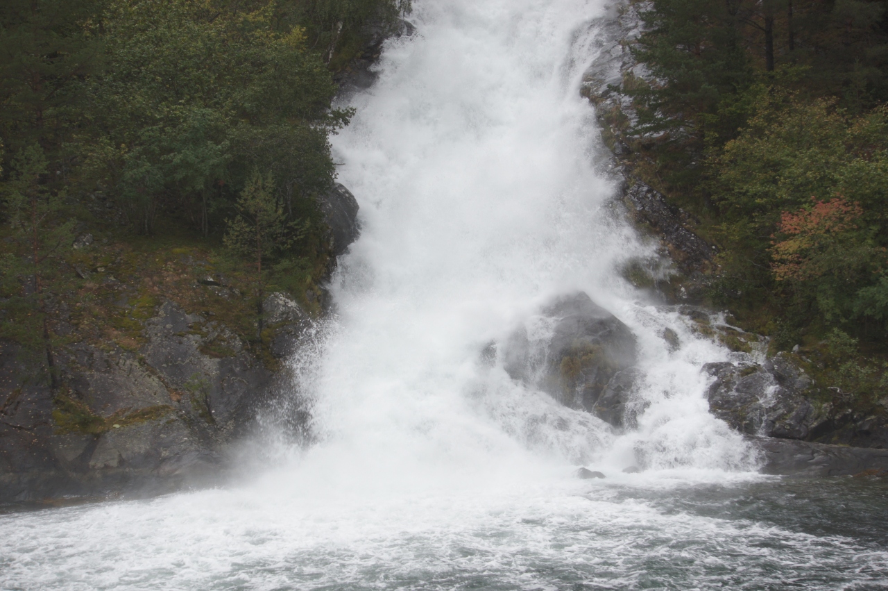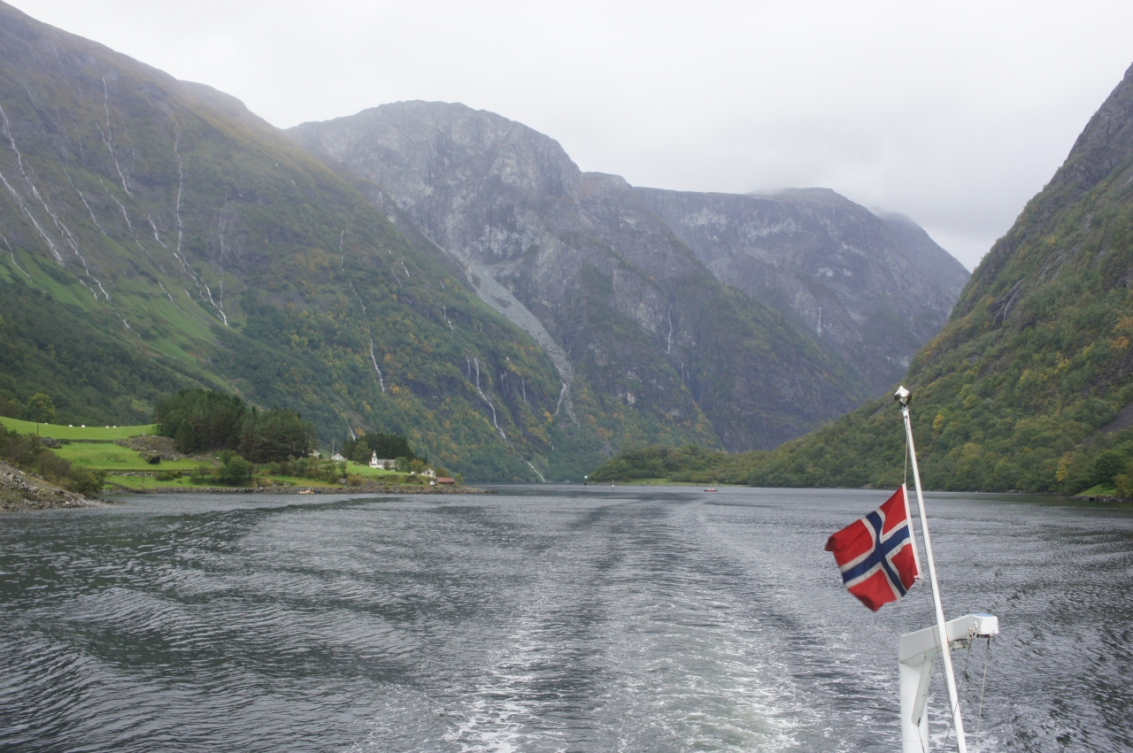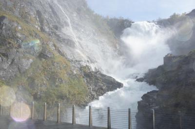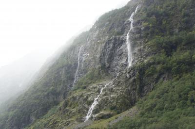フロムからグドバンゲンまで2時間のフェリー移動でした。港を出てから右にも左にも滝が無数に見えます。小さい村も見えました。雨が降ったり止んだりでしたが屋上に出て写真を写したり景色を見たりしていました。一番大きい滝の前では船を止めてくれました。