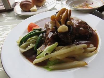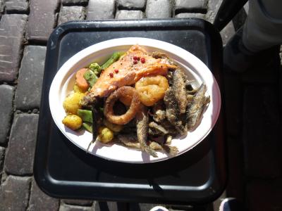 歩いていると暑いくらいでした。大勢の人でにぎわっていました。座れるところを探すのが大変でしたがやっと座れてシーフードの盛り合わせとシーフードスープを頼みました。シーフードの盛り合わせには小魚フライが山盛りでサケとイカリングフライは少しでした。でも小魚フライは美味しかったです。