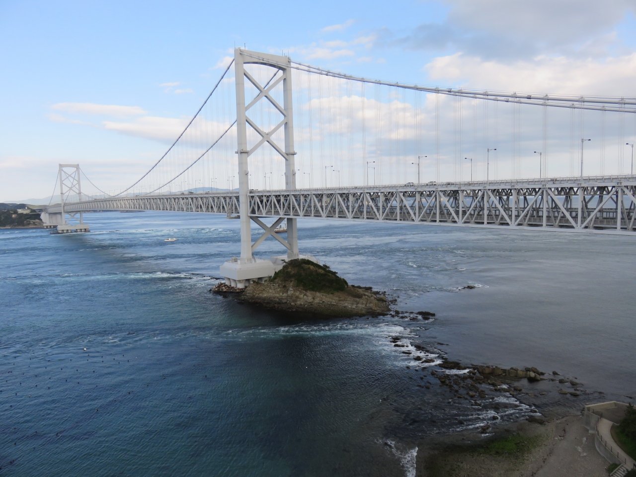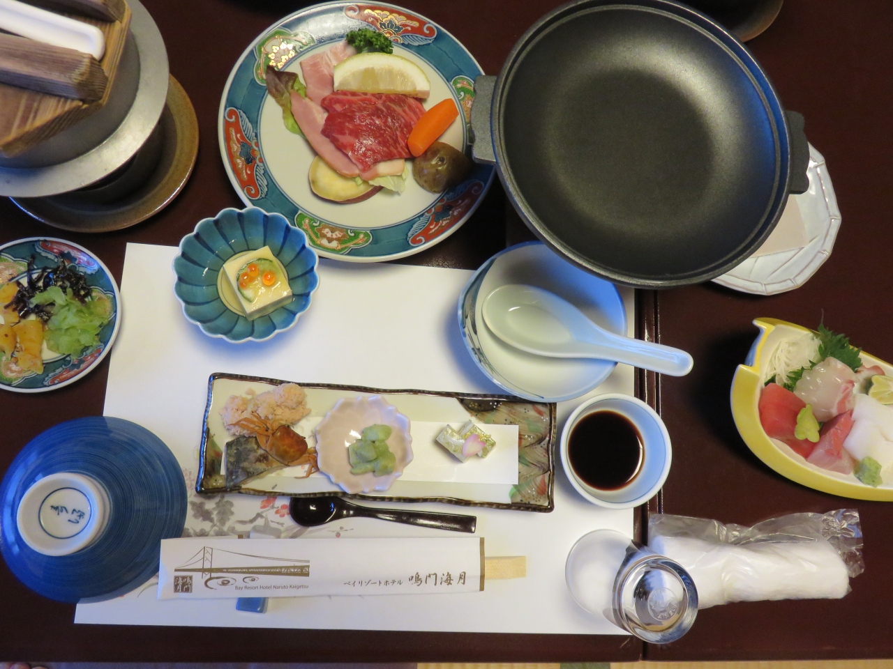 ロビーからは目の前に鳴門大橋と潮の流れが目の前でした。部屋に入ると窓からは大橋と潮の流れがすぐ近くに見えています。温泉に入るとそこからも大橋と潮の流れが見えました。橋の反対側の窓からは夕陽が沈むのが見えました。夜ご飯は部屋食でしたがお刺身や牛肉の陶板焼き、阿波鶏の鍋、鯛めしなどどれも美味しくいただきました。朝は大橋の向こうに朝日が見えました。朝ごはんも炊き立てのご飯や箱に入った小鉢が並んで楽しめました。