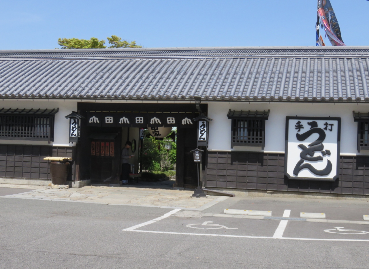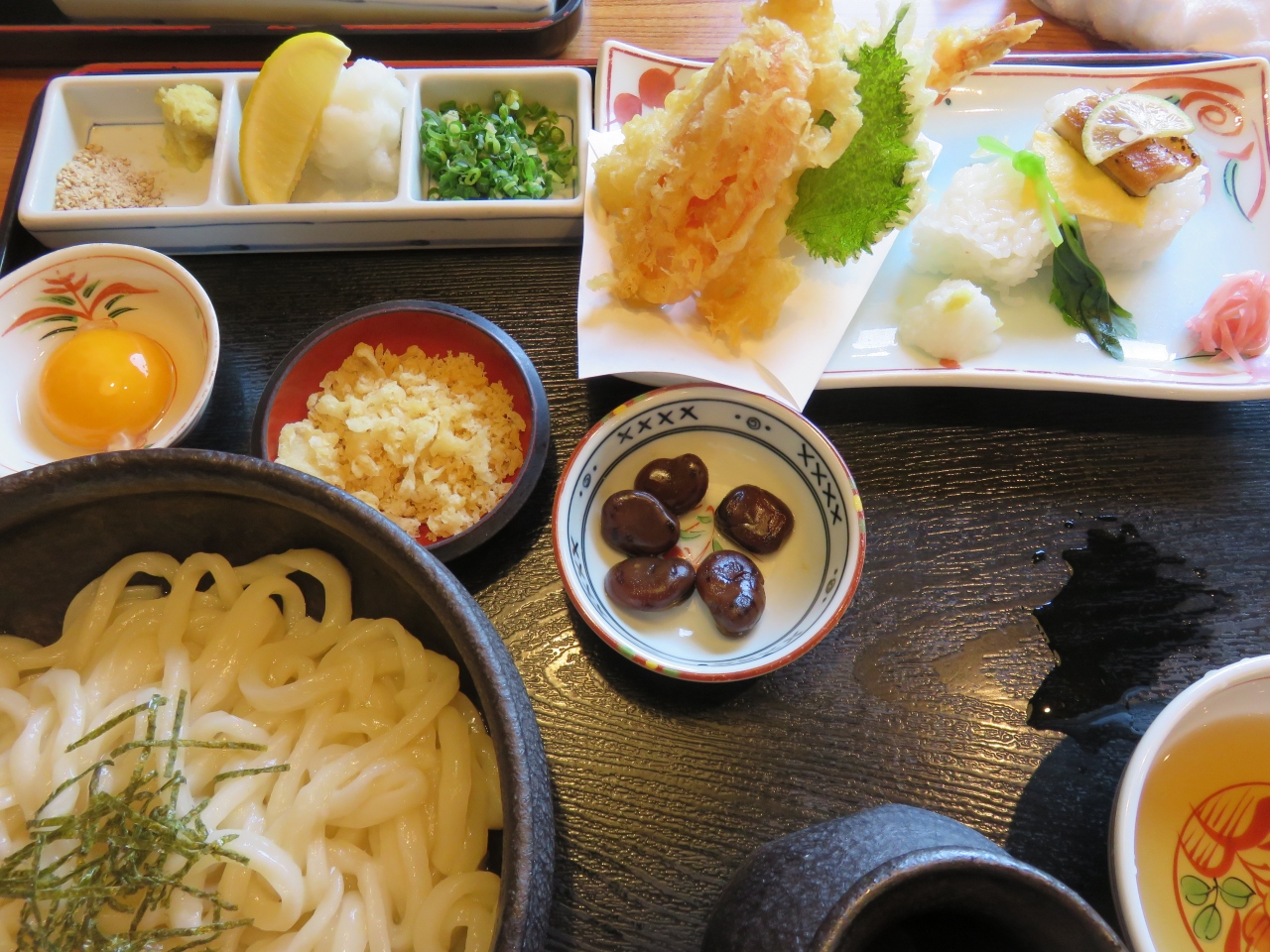 立派な建物がお庭の奥にあります。門のところに案内の人が立っていました。椅子席を希望すると椅子席専用の建物に案内されました。釜ぶっかけをいただきましたが温かい麺でもしっかりした歯ごたえがあり、てんぷらもサクサクで美味しかったです。薬味が何種類もあって味を変えて楽しめました。これで1200円なら安いと思いました。