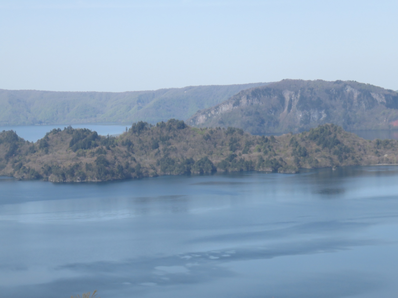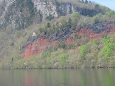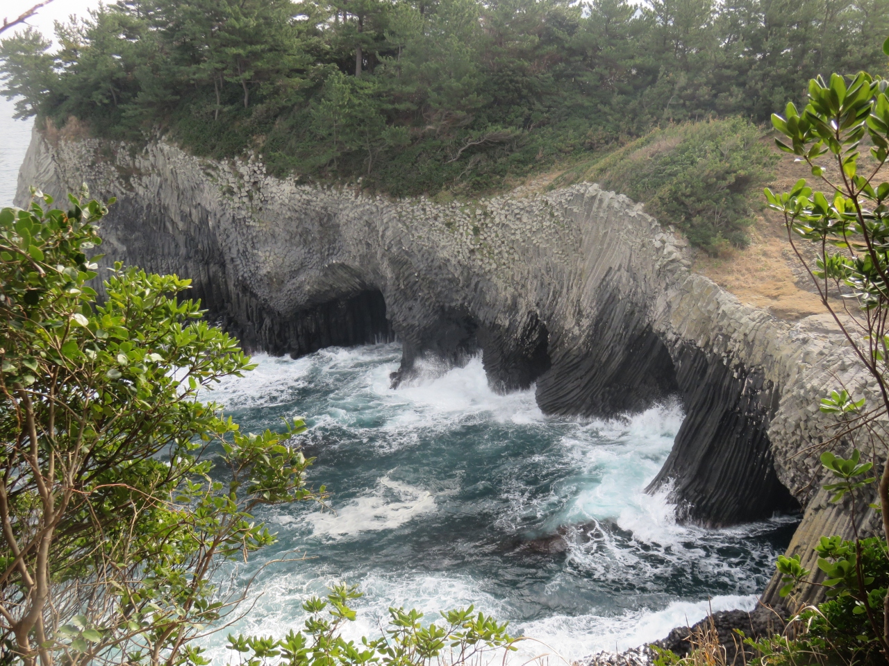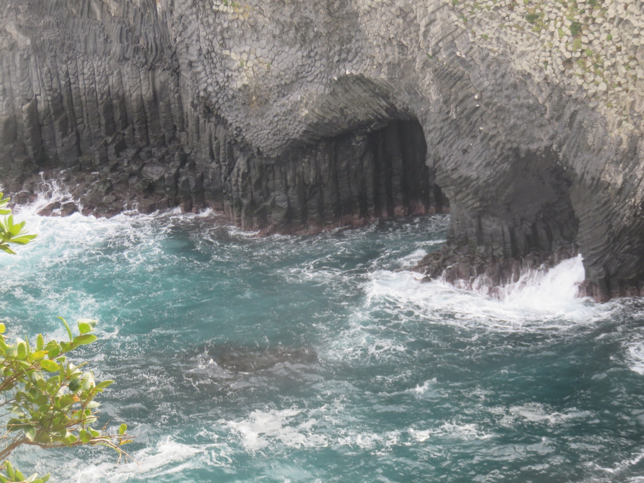 観光船に乗ろうと駐車場に入れたら係りの人が来て今日は波が高くてお客さんを乗せて出航できないので欠航です、といわれた。丘の上からでも見えますからパンフレット持ってきてあげましょう、と言ってパンフレットを持ってきてくれて丁寧に説明してくれた。ナビに入れたら七ツ釜の駐車場まで連れて行ってくれた。そこから15分か20分ぐらい歩くと展望台に出る。柱状節理の断崖にぽっかり明いた大きな洞穴が、上から見ると5つ見えた。見えないところにあと二つあるのかないのかわからない。白い波が洞窟に打ち付けていたので今日は欠航でも仕方ないと思った。ダイナミックな景色を見ることができてよかった。