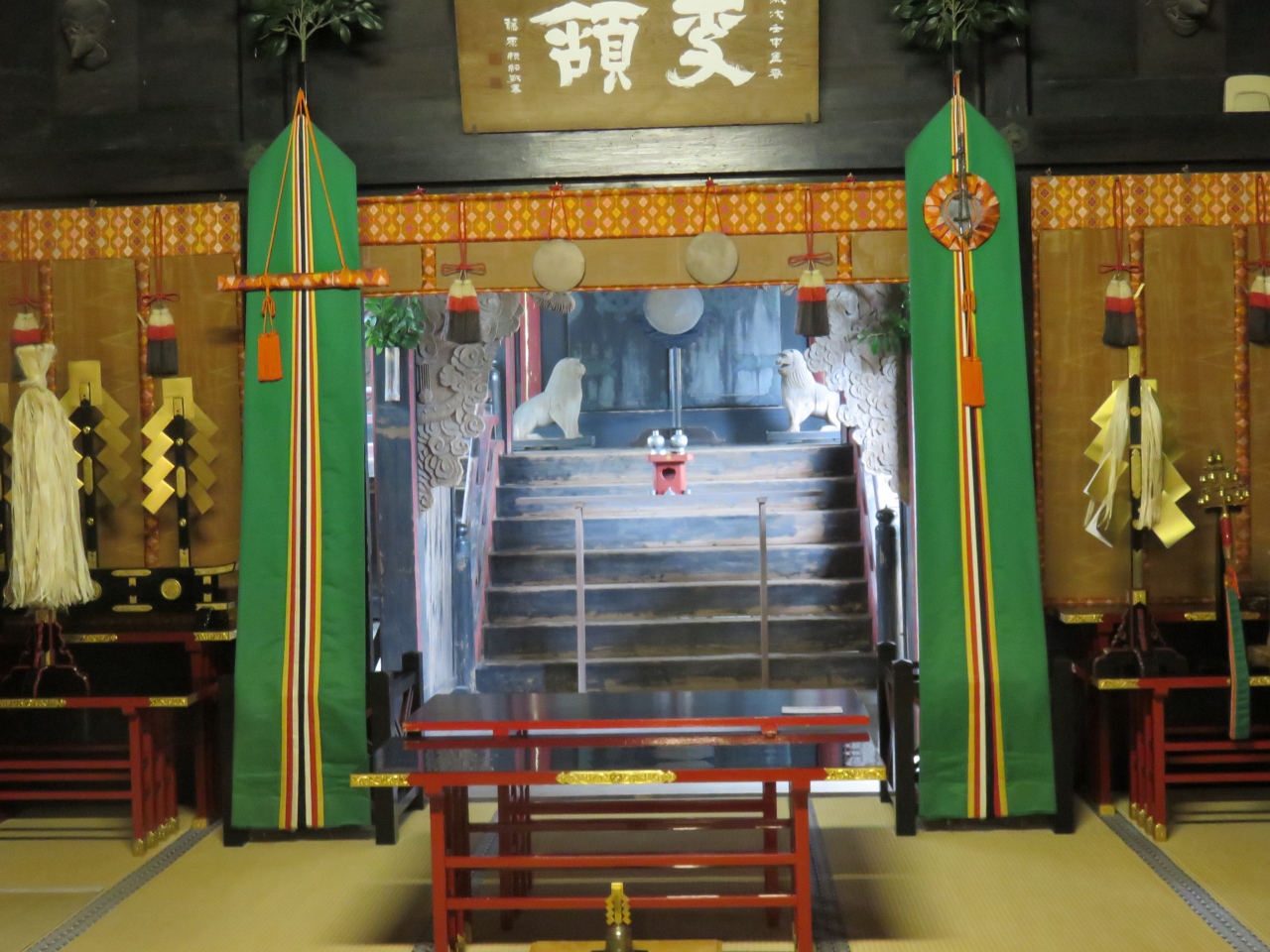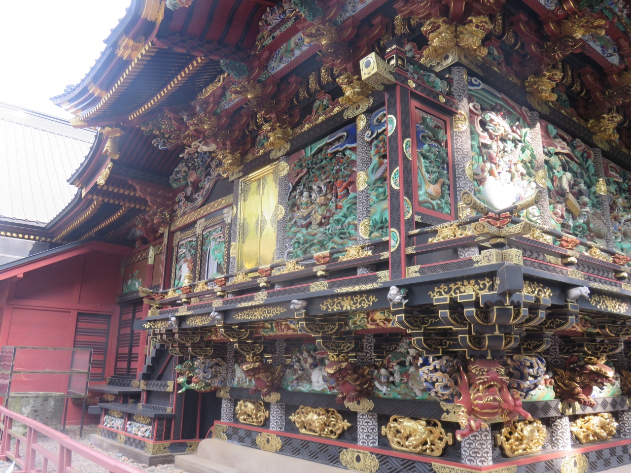 日光東照宮のようなきらびやかな本殿は平成23年に7年の補修を終えて、24年に国宝に指定されたそうです。彫刻は人物や植物、動物が細かく描写されて素晴らしく見ごたえがあります。何人か人が集まるとガイドの方が説明をしてくれて、素晴らしさの陰には多くの人の努力があることがわかりました。しかし1棟の建築物に700円の入場料は少々お高いと思いましたが、それだけ修復に費用がかかったのかも知れません。修復から年月がたっていない色鮮やかなものを見ることができて満足です。