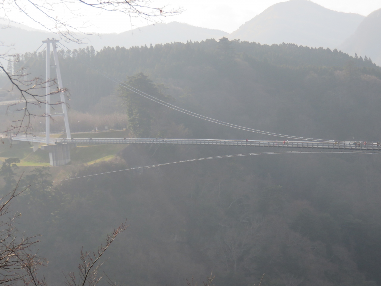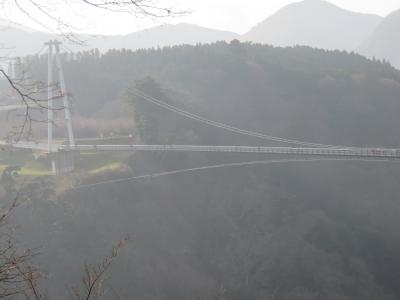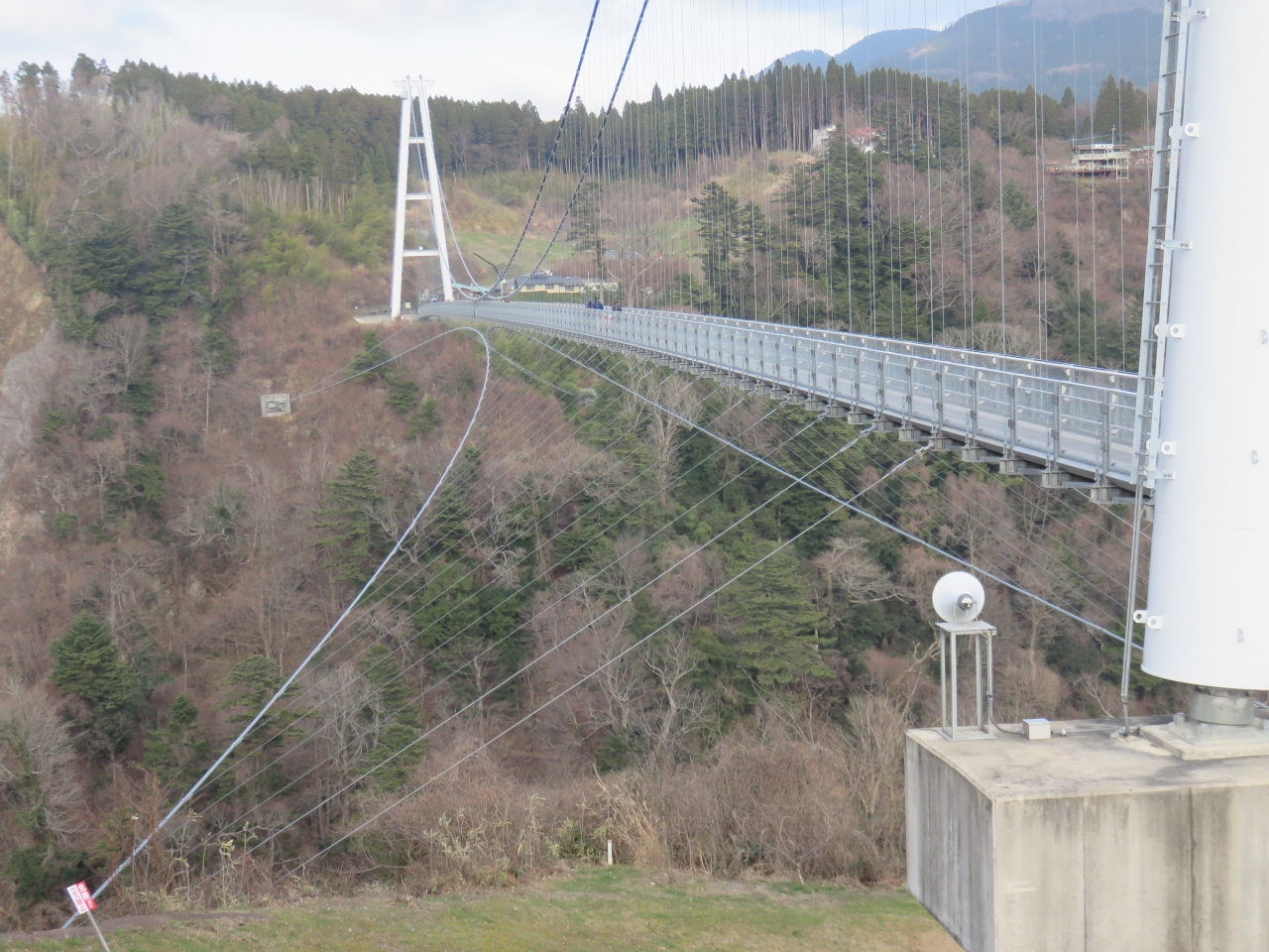 ワイヤーロープが何本もあって安全に造られた大吊り橋です。風のない暖かい日だったのですが、橋をわたっているときの風の冷たいこと。早く渡って車に戻ろうというくらい寒かったです。深い谷にかかった橋なので風をさえぎるものは何もありません。防寒が必要です。冬なので周りの山は茶色の枯れ木ばかりで残念でした。若葉や紅葉の季節に来ると素晴らしい景色だと思います。