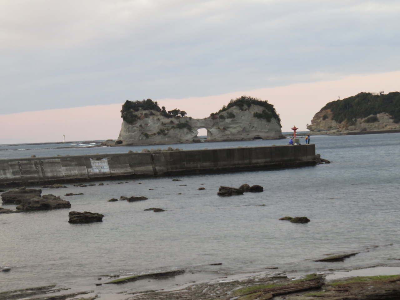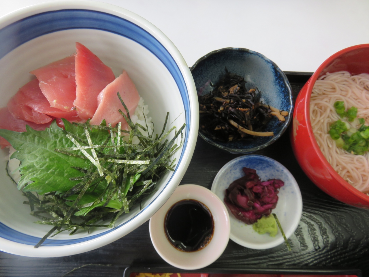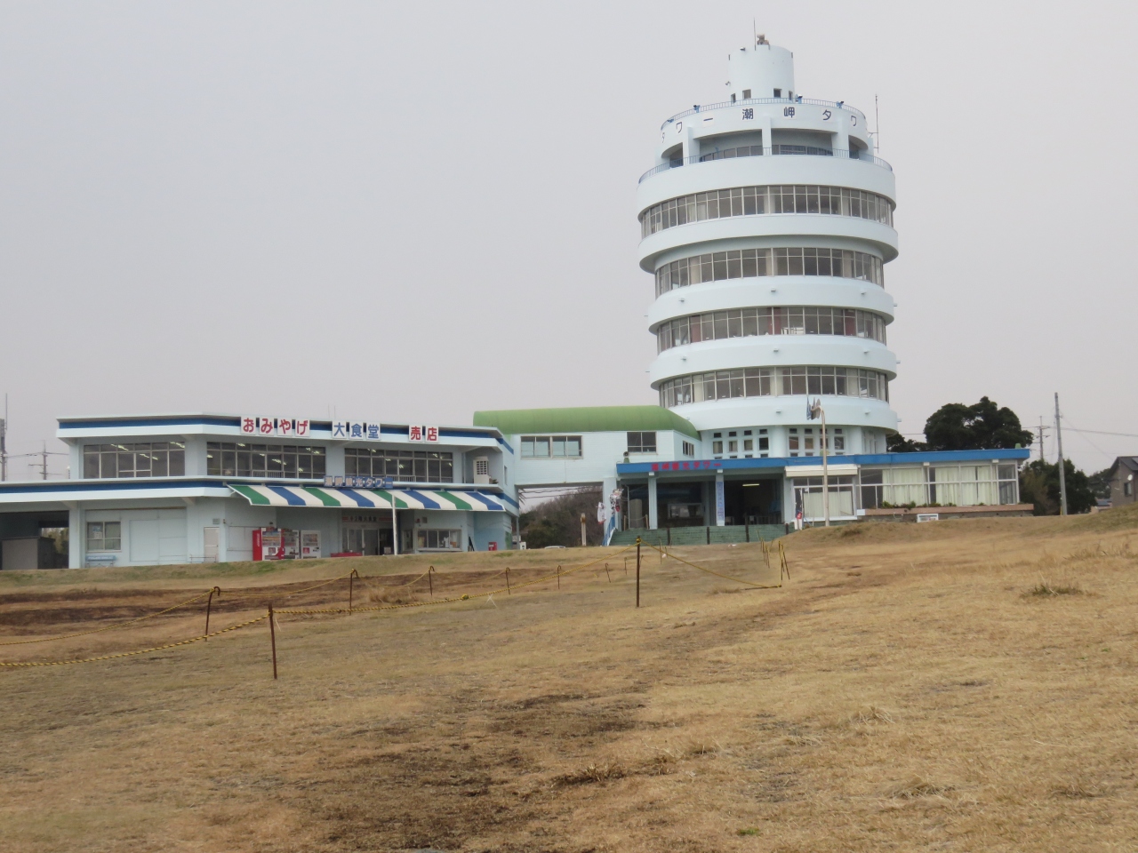 潮岬観光タワーに上って高いところからの景色を楽しんでから食事に行きました。古い2階建ての建物で、昔からある大食堂という感じです。入ったときは観光バスのお客でにぎやかでした。季節も冬だし周辺の雰囲気がどんよりした感じなので、にぎやかに人がいるのは悪くありませんでした。メニューを見るまでもなく、あちこちに近大本マグロの幟旗やポスターが貼ってあって、迷わず注文しました。味はとてもおいしくて、これが養殖なのか?と思いました。1600円で本マグロ丼が食べられるのはうれしい。
