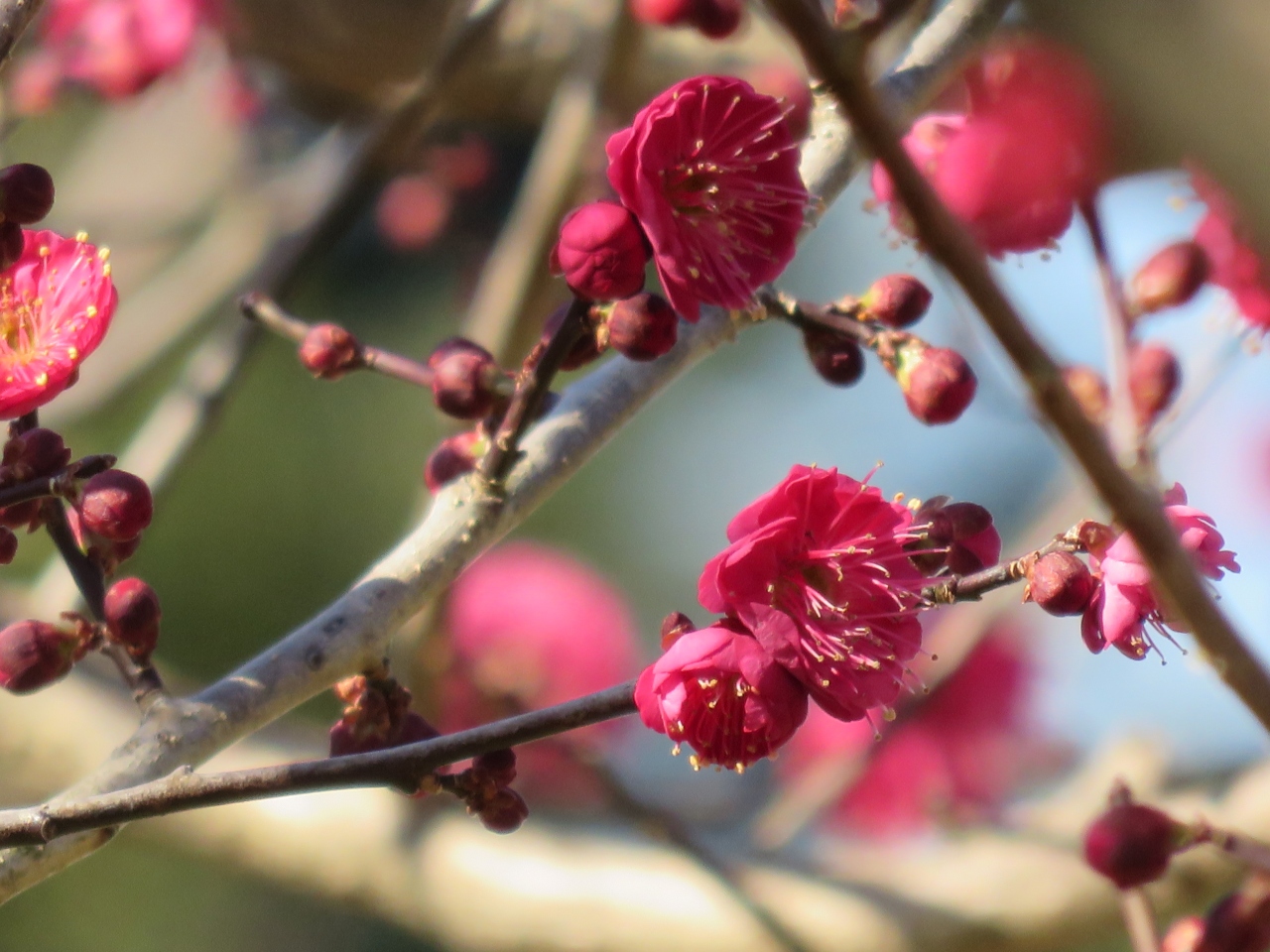 梅まつりオープンの次の日だったので、山にある梅はまったく咲いていませんでしたが、広場にある紅梅と白梅はよく咲いていました。坂をかなり上るので足が丈夫でなければいけないと思いますが、坂のおかげで遠くの海がよく見えて気持ちが良いです。数は少ないですが梅干のお店が出ていました。今は塩分控えめの梅干が多いので、自宅用に買いました。本場の梅は実の大きさや種の小ささがまったく違っていて、さすが紀州のブランド梅だと感心しました。
