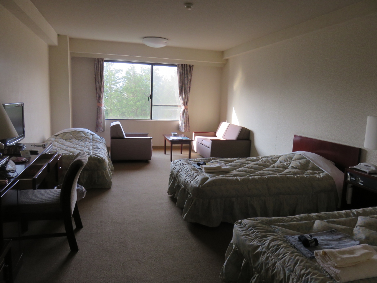 ツアーで泊まりましたが3ベッドの広い部屋でした。食事は朝夕ともバイキング。さつま揚げは会場で揚げていたので温かくておいしかったです。朝ごはんに鶏飯がありました。でも、バイキングは落ち着きません。近くに牧場があってちょうどよい散歩コースです。ホテルは大規模で新館と旧館があり、お風呂が遠くてかなり歩かなければ到着しません。女性用の露天風呂にバラの花が浮かべてあって、もう一度はいりたいと思いましたが、あの遠さを考えてあきらめました。