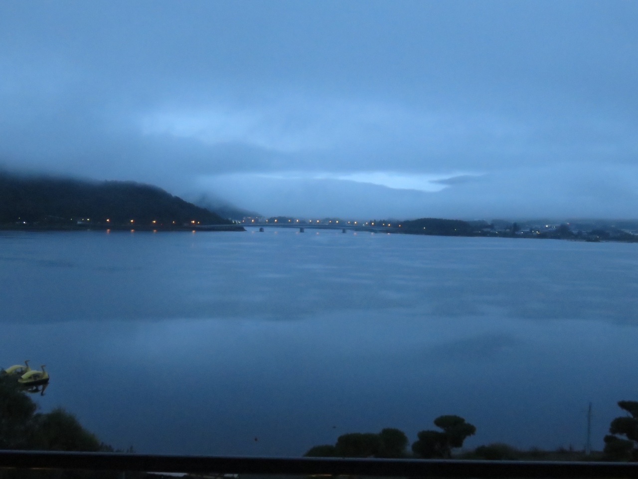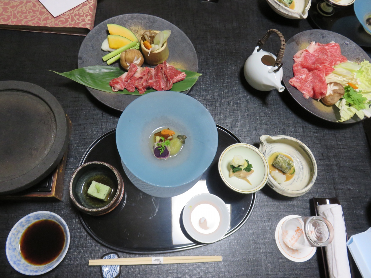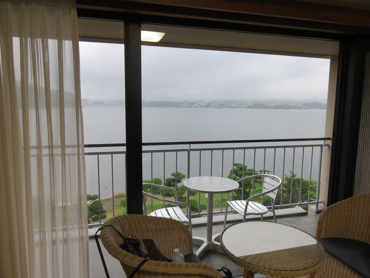 最上階の部屋の窓からは目の前に大きな富士山が見えるはずでした。そのために選んだ宿でしたがお天気はどうしようもありません。夕食は部屋食で食前酒の桃のお酒がすごくおいしくてお代わりしてしまいました。家庭では使わないような凝った器は非日常が感じられてよかったです。お風呂上りにビールのサービスがある宿は初めてでした。