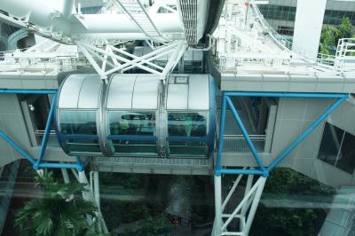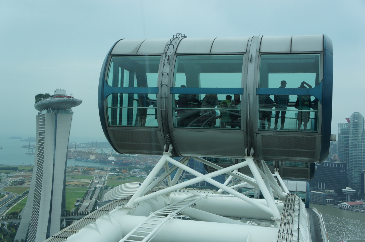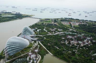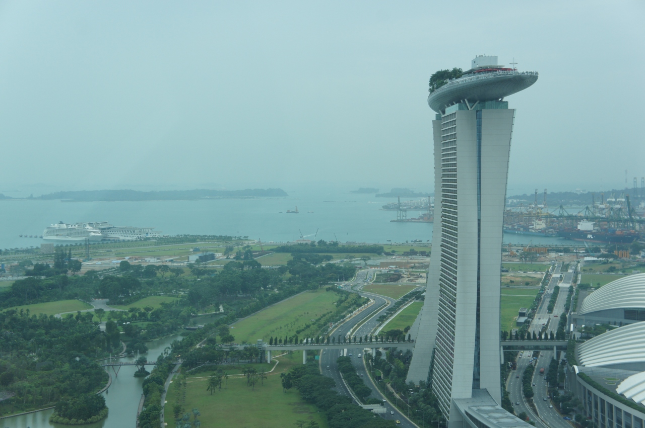 さすが200メートルは高いです。遠くの海にはたくさんの船、高層ビル群、近くにはマリーナ湾に面したユニークな建物などが見渡せます。マリーナ湾の正面にはマーライオンが水を吐き出しているのが小さく見えます。すぐ下にガーデンズバイザベイの人工ツリーが見えていて、あまり大きいと感じなかったけれど、近くに行くと巨大なものでした。かなり高いところから見ていたから小さく見えたのでした。